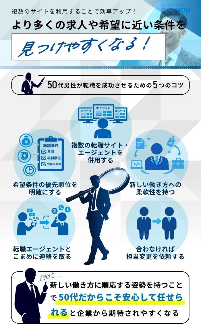 また、転職市場における50代男性の状況や、転職を成功させるための考え方、実際に役立つコツもあわせて解説しています。