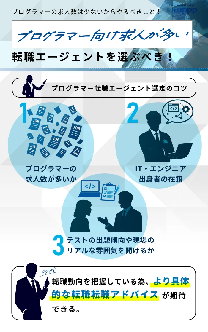 特にプログラマーは専門的な知識が求められる職種なので、IT業界の動向やプログラマーに関する知識がある担当者に当たることは転職成功への近道となるでしょう。