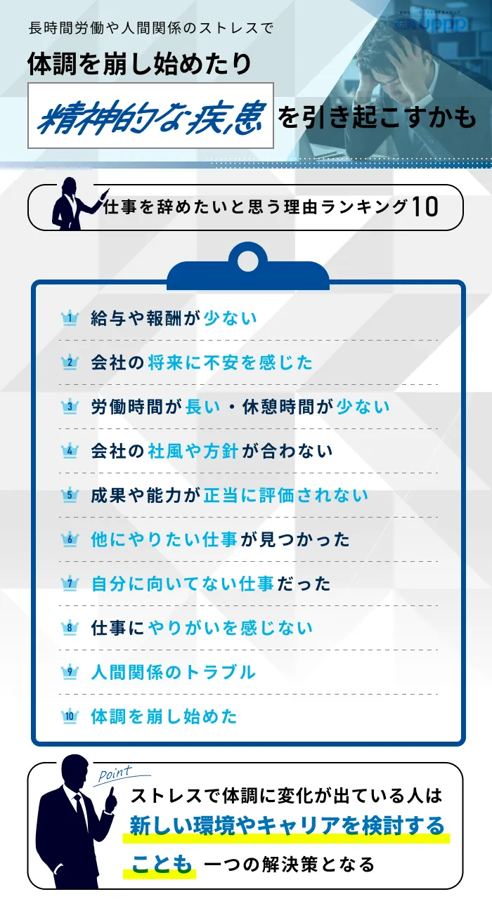 こういった環境下では心身ともに疲れてしまい、「仕事を辞めたい」と強く感じるというわけです。